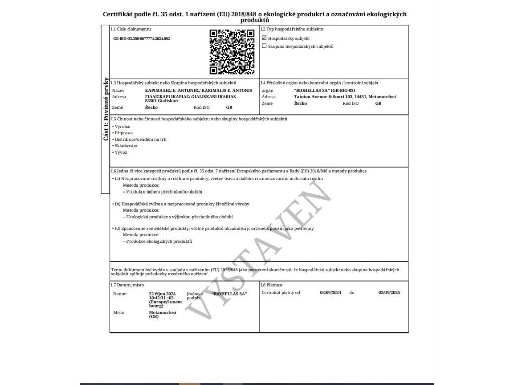 | BIO kvalita (certifikace BIO Hellas): | GR-BIO-03.300-0077774.2024.002 |