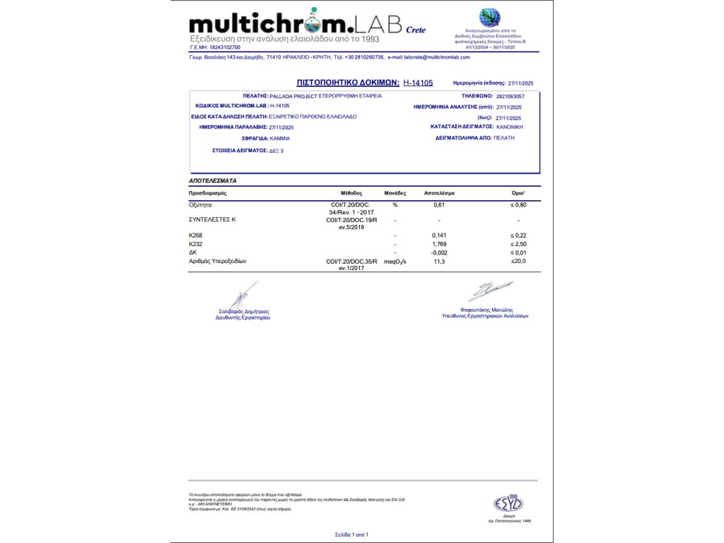 Pallada je krétský extra panenský olivový olej z oblasti Akrotiri (Chania), vyráběný výhradně z odrůdy Koroneiki. Sklizené olivy se převáží do mlýna v plastových boxech a lněných pytlích tak, aby se nevrstvily a byly větrané, a zpracování probíhá během pár hodin po sklizni lisováním za studena. Výsledkem je olej „superior“ kvality s vysokou nutriční hodnotou a co nejlepšími organoleptickými vlastnostmi.