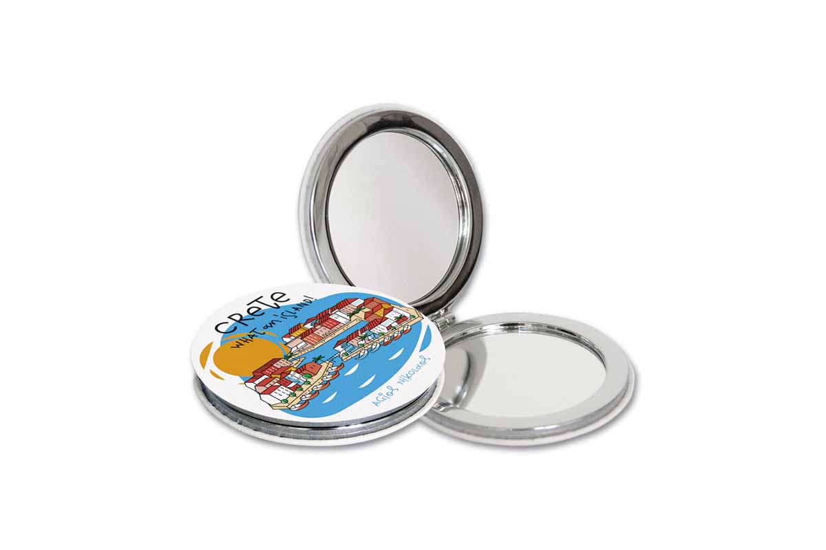 Štýlové vreckové kozmetické zrkadielko s motívom prístavného mesta Agios Nikolaos na ostrove Kréta. Praktický doplnok do kabelky, na cesty alebo ako drobný darček s gréckou...