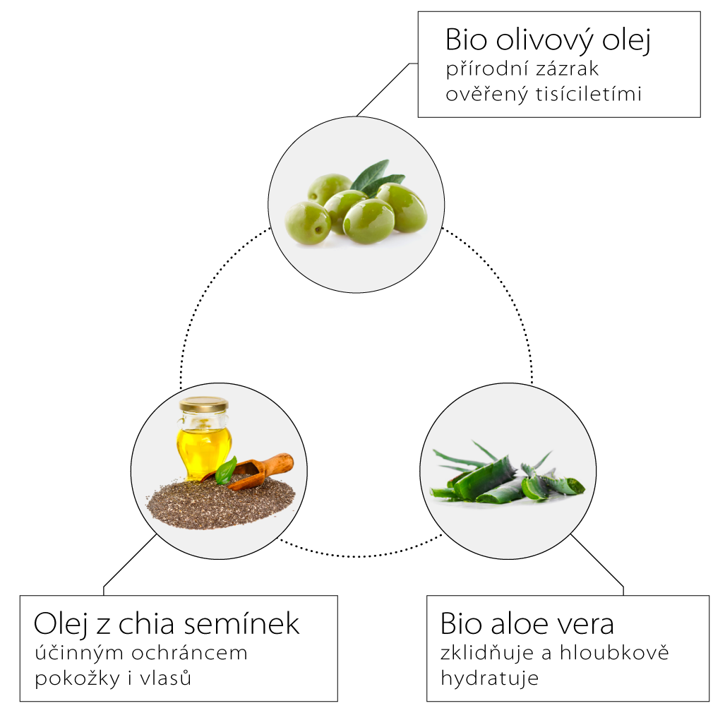 Olivový olej spolu s extraktom z aloe vera pôsobí protizápalovo, vyživuje a hydratuje. Túto kombináciu teda určite ocení vaša pokožka aj vlasy. Ochranu následne zabezpečuje olej zo semien chia.